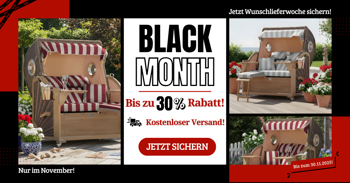 Mit dem Black Month sichern Sie sich echte Manufakturqualität zu fairen Preisen. Hanseatisch ehrlich, ohne leere Versprechen. Sichern Sie sich jetzt bis zu 30% Rabatt und lassen Sie sich Ihren Strandkorb versandkostenfrei liefern!