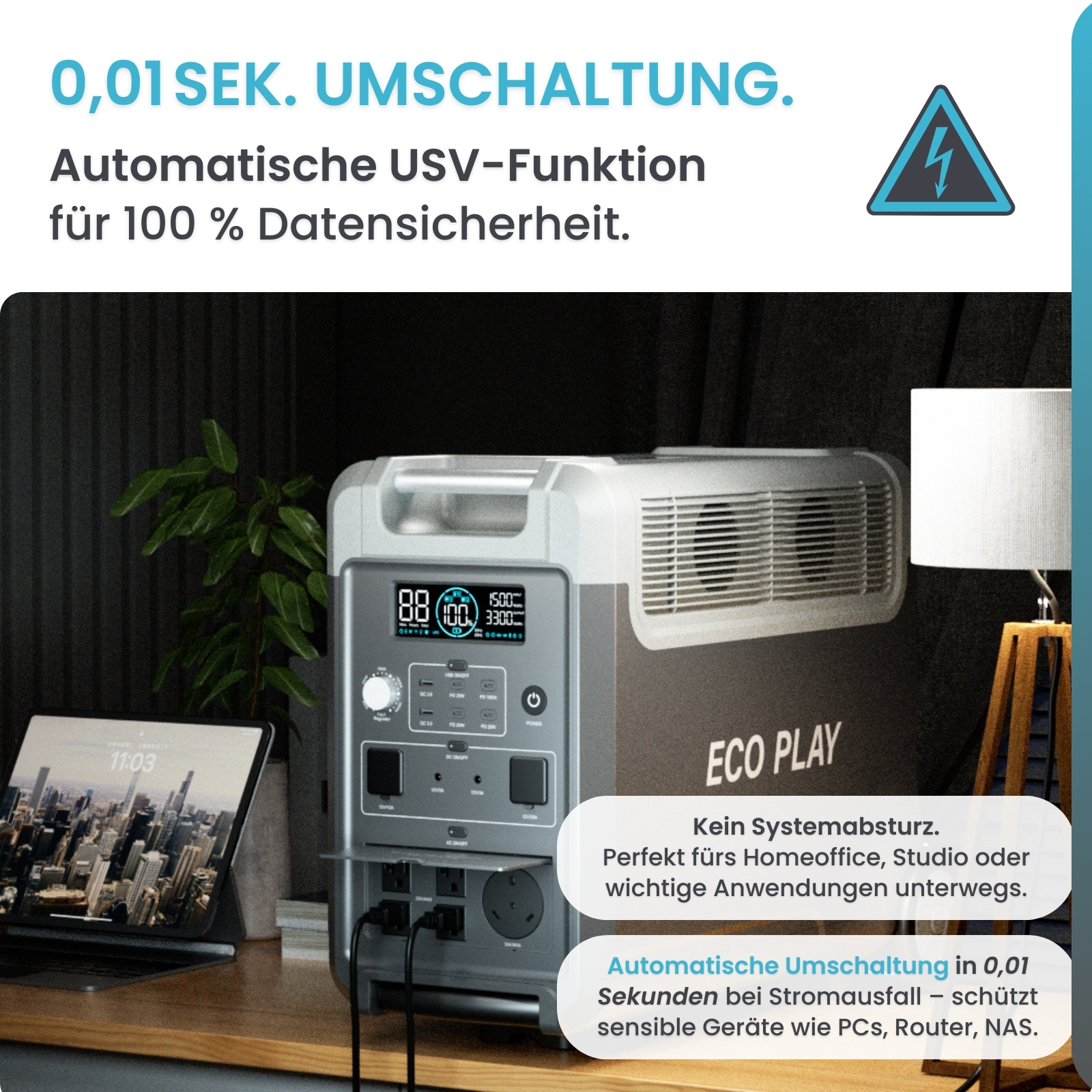 • EcoPlay 2400W: Perfekt für den Strandkorb im Garten oder kurze Outdoor-Aufenthalte – lädt Smartphones, Tablets, Lautsprecher und kleine Elektrogeräte sicher und schnell.