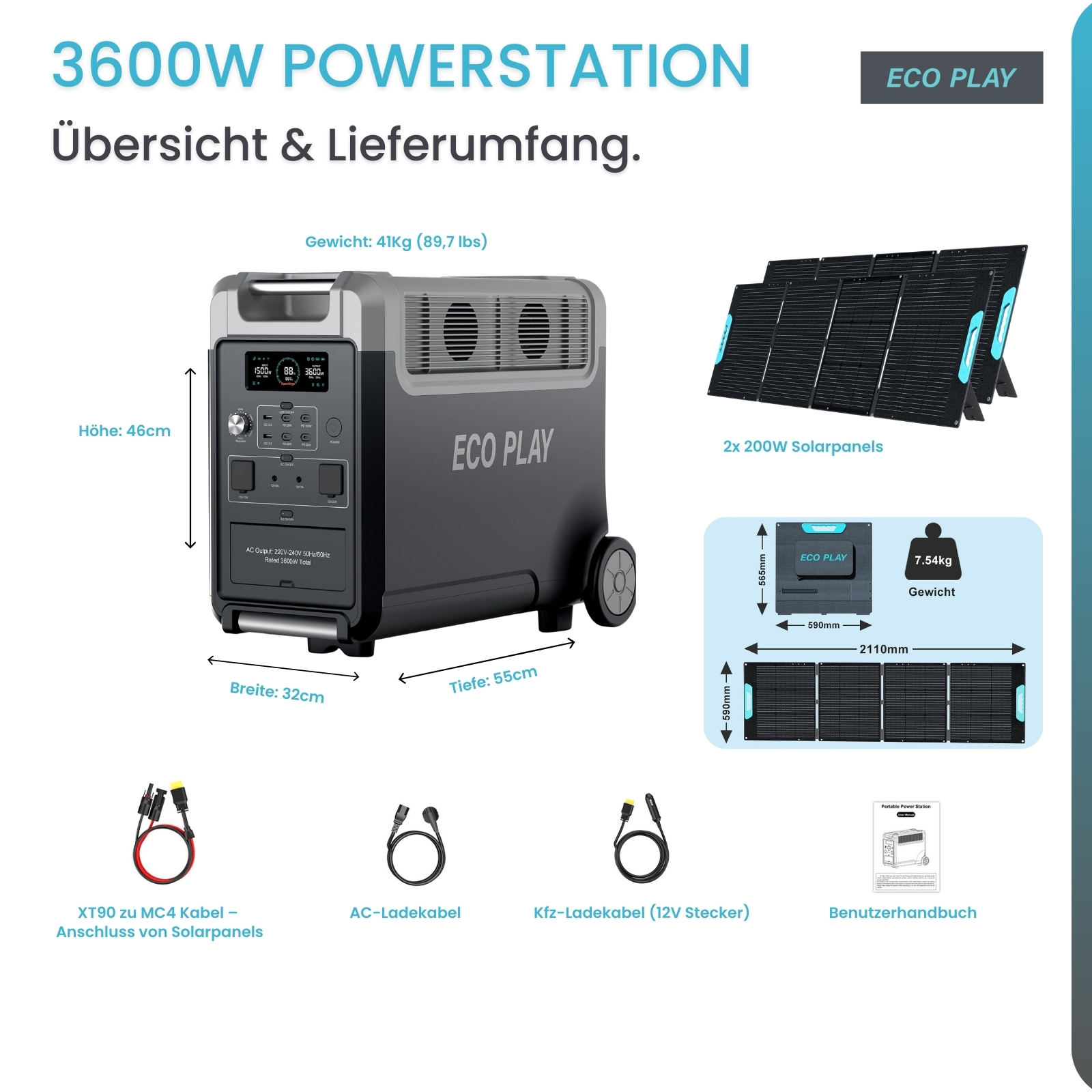 • EcoPlay 3600W + 2× 200W Solarpanels (400W): Maximale Autarkie für Offgrid-Lösungen, Festivals, Wohnmobile oder als Notstrom-Backup für Ihr Zuhause.