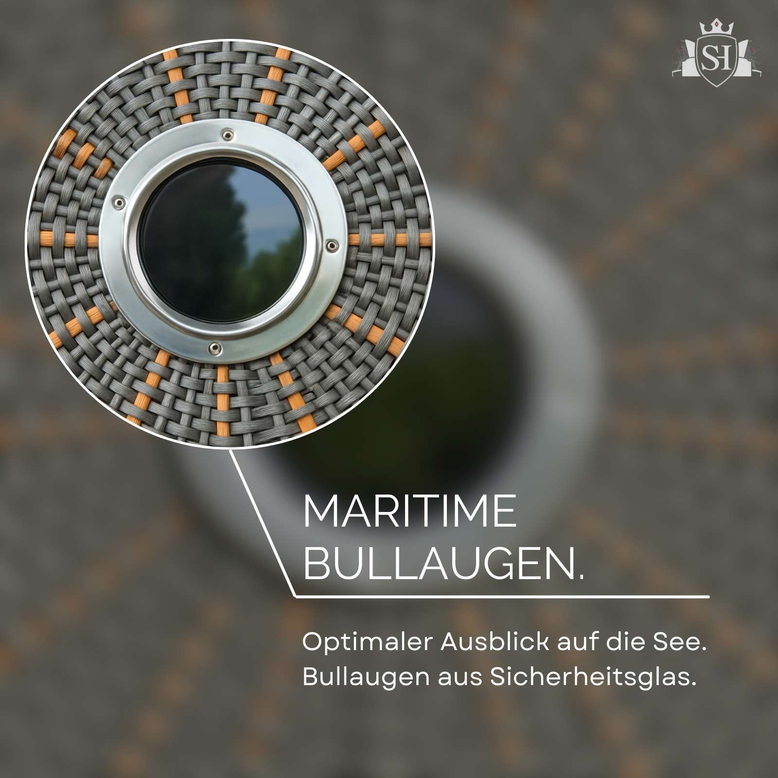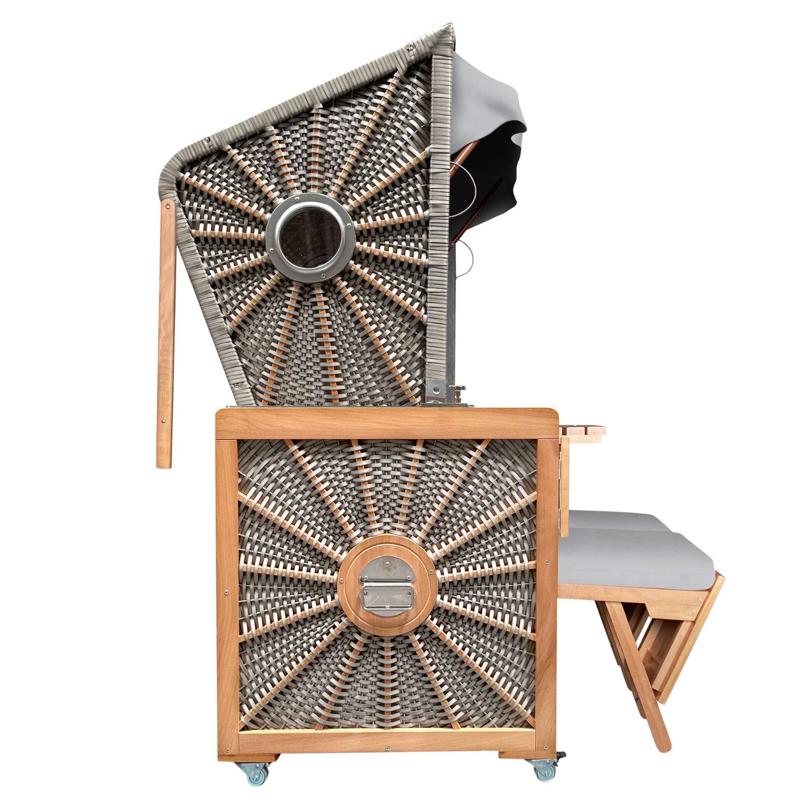 Das hochwertige Zusammenspiel aus robustem Okoumé-Holz, handgeflochtenem Polyrattan in Sonnenoptik und klassischen maritimen Elementen wie Bullaugen verleiht dem Strandkorb seinen zeitlosen Küstencharakter. Ob im Garten, auf der Terrasse oder dem Balkon – dieser Strandkorb wird zum stilvollen Mittelpunkt Ihres Outdoor-Bereichs.