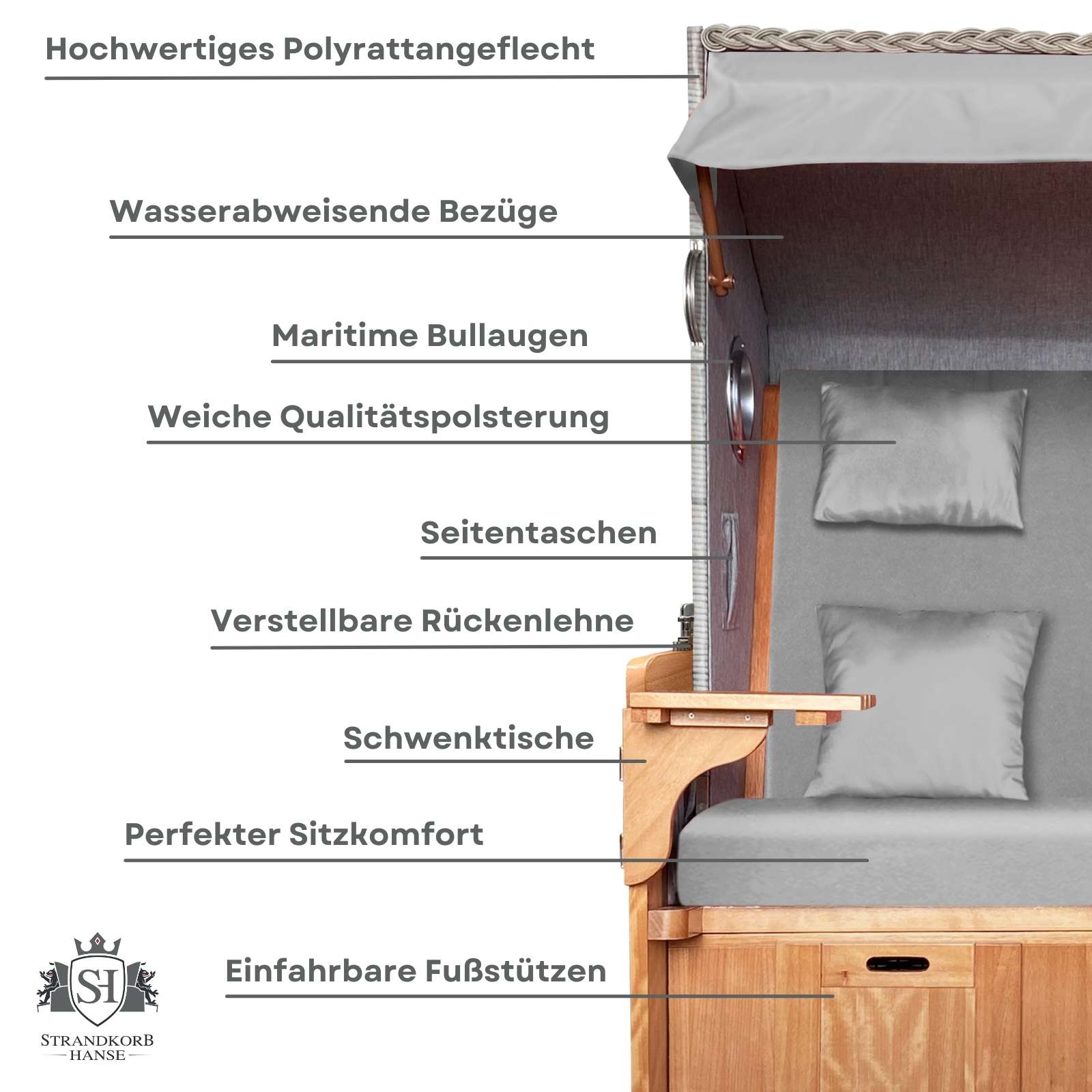 •  Nordsee-typische Voll-Liegefunktion – Rückenlehne komplett nach hinten verstellbar bis zur entspannten Liegeposition, stufenlos & einfach bedienbar. Durchdachtes Design mit maritimen Details – Inklusive Bullaugen, 2 Schwenktischen, Zeitungstaschen & einfahrbaren Fußstützen